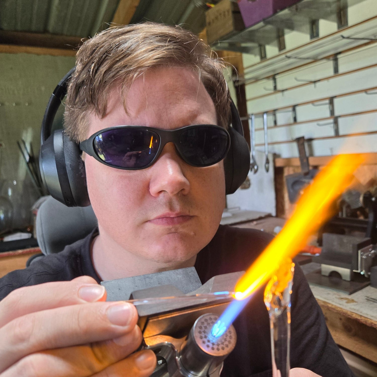 Travers Thurman is a flameworker and glass artist based in the mountains of Western North Carolina, where he creates intricate borosilicate glass marbles and paperweights, specializing in encasing detailed tree forms in clear glass. His process involves mixing colors into cane, drawing them down into fine stringers, and using these to handcraft elements of the trees. Through careful placement of semitransparent colors and layers of clear, he aims to mimic the effect of light passing through leaves when the artwork is backlit. This technique requires precision to avoid bubbles and burn marks.